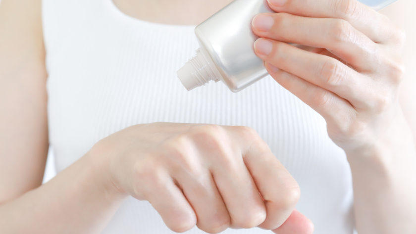 - 保湿タイプ…かさつきが気になる時はセラミド、コラーゲン、ヒアルロン酸、尿素、スクワランなどが配合されているものがよいでしょう。特にセラミドは肌の成分に近いため、乾燥対策によいとされています。病院でも処方されるヘパリン類似物質などもよいですね。ワセリンが肌の表面を覆って水分の蒸発を防ぐのに対し、ヘパリン類似物質は肌内部の角質層まで浸透し、そこで肌の細胞に働きかける高い親水性と保水性を持っています。尿素は肌が固くごわごわしているときに効果を発揮します。保水力だけではなくかたい角層をとりのぞいて、皮膚を柔らかくしターンオーバーを促進する効果があります。