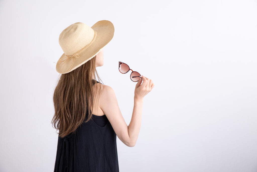 - UVカット効果のあるサングラスや眼鏡…斜めから降り注ぐことで、目に入り込む紫外線の量が増えます。角膜に紫外線があたると、炎症が起きたり、目が痛んだり、充血したりといった症状が出ます。紫外線を受け続ければ目の細胞が破壊されてしまいます。老眼や白内障にも紫外線が関係しています。目から入る紫外線はメラニン色素を生み出しますので、シミの原因にもなりえます。UVカット効果のあるサングラスや眼鏡、コンタクトレンズなどを使用することが有効です。