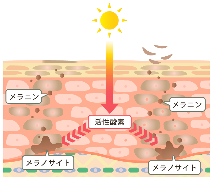紫外線を浴びると、表皮の最下層に存在している「メラノサイト」が、細胞を守ろうとしてどんどん黒いメラニンを作り出します。