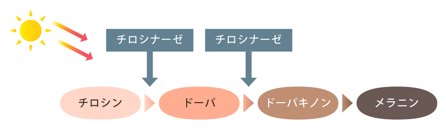 メラニンは、表皮の一番下の基底層に存在しているメラノサイトの中にあるメラノソームと呼ばれるラグビーボールのような形をしている顆粒です。チロシンというアミノ酸が元となり、「チロシナーゼ」や「TRP-1」、「TRP-2」などの酵素の働きで「チロシン」が酸化され最終的に「メラニン」が作られるのです。