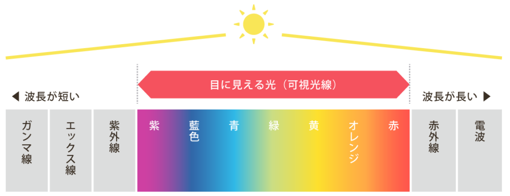 ちなみに、可視光線とはその名の通り「眼で見える」波長で、紫·青·水色·緑·黄色·橙色·赤の順番に波長が長くなります。紫外線は可視光線「紫」よりも波長が短いもの、「赤外線」は可視光線「赤」よりも波長の長いものになります。