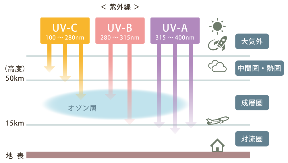 紫外線C波は地球の成層圏にあるオゾン層で遮られるので地上に到達するのは基本的に、紫外線A派(UVA)と紫外線B波(UVB)の2つになります。