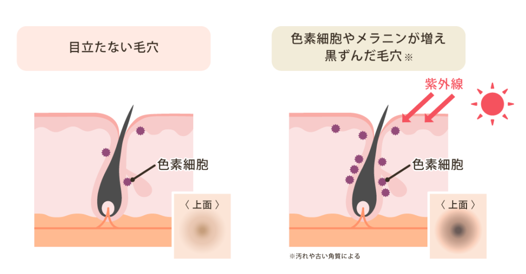 毛穴の入口の表皮の構造が変形し、メラニンを作り出すメラノサイトが毛穴の方向に沿って縦に並んだ状態になることがあります。そうすると、肌の表面からはメラノサイトが集まった状態に映り、黒ずんで見えるのです。
