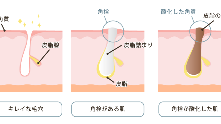 毛穴の出口付近の古い角質や汚れなどが皮脂と混ざり合い毛穴に詰まったものを「角栓」といいますが、この角栓が酸化して、毛穴が黒く見えることもあります。